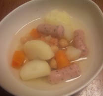鍋というか壷みたいなもので作る料理がコシードだそうです。 じゃがいも、人参、キャベツ、チョリソ、鶏の骨付肉、牛バラ ガルバンゾを鍋に入れ、水、塩を加えて煮る。それだけ。 塩の分量は適宜になってましたが少々強めがいいかな? 具材と汁を分けてしまうので。 汁気を切って具材を取り出し、残った汁に極細のパスタを入れて 野菜の塩茹でとパスタスープ の2品完成。 2品にしちゃう所が家庭料理の知恵ですね~。 |