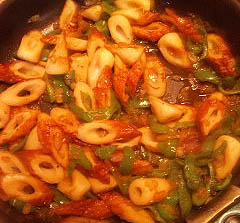 1.フライパンに油、輪唐辛子、ニンニク、玉ねぎのみじん切り入れて