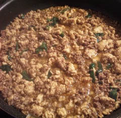 5.豆腐を加え、水気が半分まで飛んだら醤油、オイスターソース、砂糖