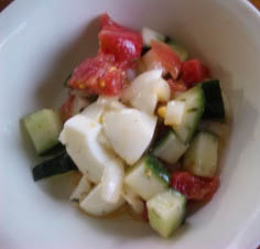 玉ねぎ、トマト、きゅうりを小さな賽の目切りにして