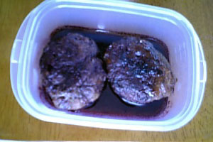 市販の、既に成形されて「焼くだけ」状態の生ハンバーグ使用。
