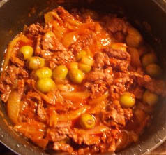 ④:オリーブを入れ塩コショウで味を調え、15分煮込む。
