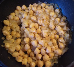 3.玉ねぎがキツネ色になったらひよこ豆と茹で汁を加え炒め煮する。
