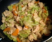 豚肉→白菜(白)+人参→白菜(緑)と炒めます。