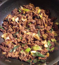 3.豆板醤、甜麺醤、醤油、酒の合わせ調味料を加えて絡め、