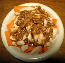 ②:鶏肉、ニンジンを茹でる。鶏肉は手で裂く。