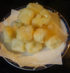 熱した油で軽く揚げ、最後に粉糖をかける。