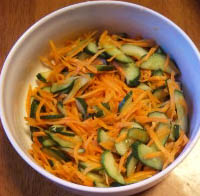 1.胡瓜、人参を細切りして塩をなじませしんなりなせる。