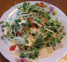 1.トマト、豆腐はさいの目切りにし、貝割れ菜を散らす。