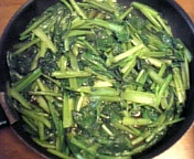油を入れた水でさっと茹でて、 炒める時に水が出ないようにするんですが 面倒だったので普通に炒める。 生姜、ニンニクを油で熱した所へ 固い茎部を入れて先に炒め、 火が通ったら葉の方を加え 鶏がらスープの素、酒、醤油で味付け。 ベーシック中華。 |
