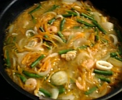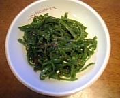 ①:フライパンに油を引き人参を炒める。 ②:①がしんなりしてきたらピーマン、えのきを入れる。 ③:②がしんなりしてきたらエビを加える。 ④:③に火が通ったら塩、コショウ、鶏がらスープの素、 水、片栗粉を加え一煮立ちさせトロミをつける。 ちょっとコショウが効き過ぎかな?; 蒸し豆腐なんかにかけるのだそうです。 ご飯に掛けて食べちゃった。 |