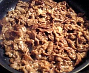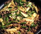 ①:牛肉におろしニンニク、塩、酒、サラダ油、片栗粉で下味をつける。 ②:フライパンに油を引き炒め、黒コショウを加え混ぜる。 ③:しょうゆ、オイスターソース、酒を入れ、最後に水溶き片栗粉を加える。 黒コショウ多目、そして合わせ調味に黒酢を入れる。 濃厚な味のなかにさっぱり感があります。 |
