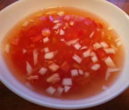トマトで作るガスパチョになります。 みじん切りしたトマト、玉ねぎに 塩、タバスコ、 冷えたミネラルウォーターを加え 輪切りのレモンを浮かべオリーブ油を垂らして 出来上がり。 オリーブ油が美味しいものほどより美味しく仕上がります。 熱を通さないので水の味もストレートに出ます。 今の季節に冷たいスープもいいですね~。 PR |