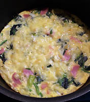 レシピは玉ねぎ、ほうれんそう、パセリ、 ハム又はベーコン、プルーンとなっていましたが 残り物を使う料理らしいので具材は何でも。 溶いた卵にドライイースト、小麦粉、牛乳を混ぜ 細かくした具を加え塩コショウし 容器に入れたらバターを散らしてオーブンへ。 野菜いっぱいのオムレツみたいな感じですが イースト入れるんですね。 生クリームを使うキッシュより油脂分少なめで 体にいいかも? |