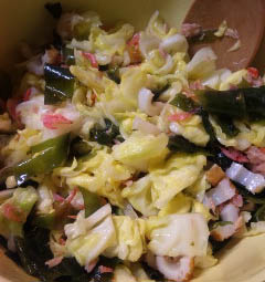 1.キャベツは塩で揉んで少ししんなりさせる 2.戻したワカメ、半月切りの竹輪、桜エビ、ツナ缶を混ぜて 出来上がり。 もう一種野菜か海草類欲しかったですねw 塩を強めに加えたのでドレッシングが要らない味でしたが ドレッシングを掛けたい方は、塩を控えるとか 塩の代わりに酢をちょっと使う とかしてみてください。 |