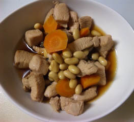 レシピでは人参でじゃなく筍を使ってました。 旬を過ぎちゃっているので人参で。 鶏肉は醤油で下味をつけてから炒め 水、醤油、砂糖、みりんを加えて 人参を入れ10分煮ながらアクを取り 大豆の水煮を加え10分煮る。 「作っておくと、便利なおかず― スピード・作りおきおかず」より |