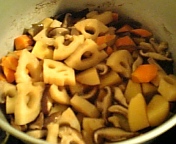 きぬさやを最後に入れると彩りが良いです。 合わせ調味を鍋に入れ、切った野菜も入れて煮るだけ簡単煮物。 煮る前にレンコンはレンジで加熱~ とレシピにあったのですが、これは灰汁抜き? よく分からなかったので、結局酢水につけて 灰汁抜きしました。 |
