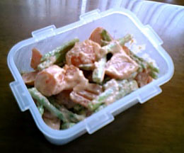 市販の明太マヨネーズを使うととてもカンタン。 まぁマヨネーズと明太子個別に買っても簡単。 茹でた野菜に和えるだけ。 じゃがいもやレンコンのような淡白な野菜も合います。 他のバリエーションにホタテのソテー等に和えるのもあります。 |