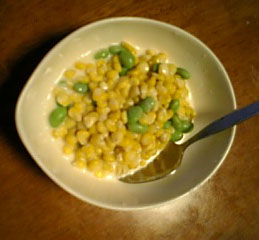 バター……………テキトウ 小麦粉……………テキトウ 牛乳………………テキトウ コンソメ(粒状)…テキトウ コーンも枝豆も既に火通っているので煮てないですけどね。 ブールマニエ(バター+小麦粉)や牛乳は好みの量でとろみを調節して下さい。 スープにする場合、コーンや枝豆を潰さないとならないので 面倒だなぁ、と思いクリーム煮に。 しかしこの後噛むのがかなり面倒に。 顎疲れましたよ; |