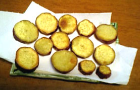 弱火で、中まで火が通るまでじっくりと揚げます。 常温の油に入れてから熱しはじめるとホクっとするそうです。 もっと大ぶりに切って使う場合は蓋をして揚げて下さい。 黒砂糖と塩を振っていただきます。 黒砂糖なかったので普通に白砂糖使用でしたが悪くないですよ。 |