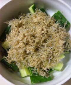 1.きゅうりは手で叩いて割り、適当な長さに切る。 2.小女子を胡麻油でカリカリに炒める。 3.②を①に乗せ、擦り胡麻、醤油をかける。 簡単一品。 右肘痛かったので叩き割りはしませんでした・・・ 叩いて、表面積を増やすと味がよく絡みます。 よかったらポチっとして下さい。 |