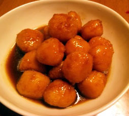 1.蓮根は水につけてアクを抜き摩り下ろす。 2.軽く水気を絞った①に、小麦粉と塩を加えて丸め熱した油で揚げる。 3.鍋に②と醤油、酒、砂糖、水を加え汁気がなくなるまで含め煮にする。 もちっとしますが、擦りきれなかった小さな破片がシャキシャキします。 もちもち感も、山芋や上新粉とはまた違いますね… この食感から蓮根は想像出来ないでしょうが。 禅寺料理より。 よかったらポチっとして下さい。 |